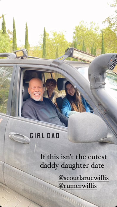 Willis’ wife, Emma Hemming Willis shared an Instagram story of The Sixth Sense actor smiling in the driving seat beside Scout while his eldest daughter Rumer sits in the backseat.
