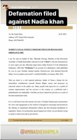 Within 24 hours of the defamation suit, Nadia Khan got back to Sharmila with a legal notice of her own. In a note on Instagram this Sunday, the morning show host wrote.