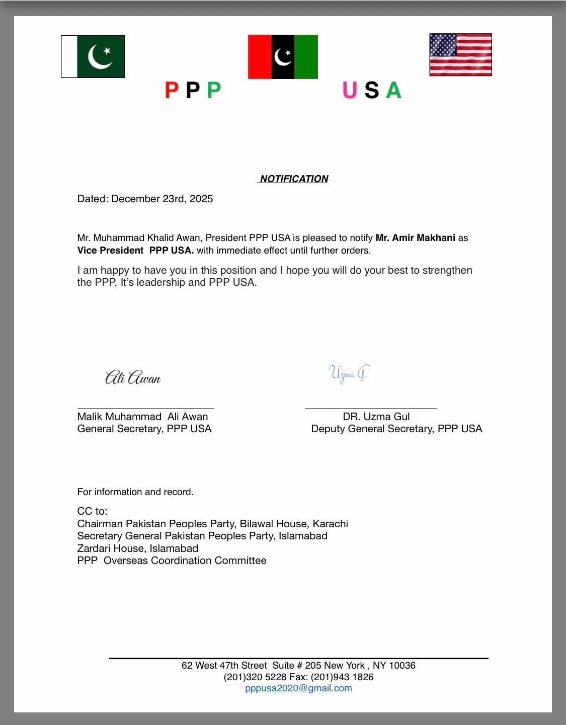 The notification bears the signatures of Malik Muhammad Ali Awan, General Secretary of PPP USA, and Dr Uzma Gul, Deputy General Secretary. Copies of the appointment have also been forwarded for information and record to the Chairman of the Pakistan Peoples Party, Bilawal Bhutto Zardari, the party’s Secretary General, Zardari House in Islamabad, and the PPP Overseas Coordination Committee.