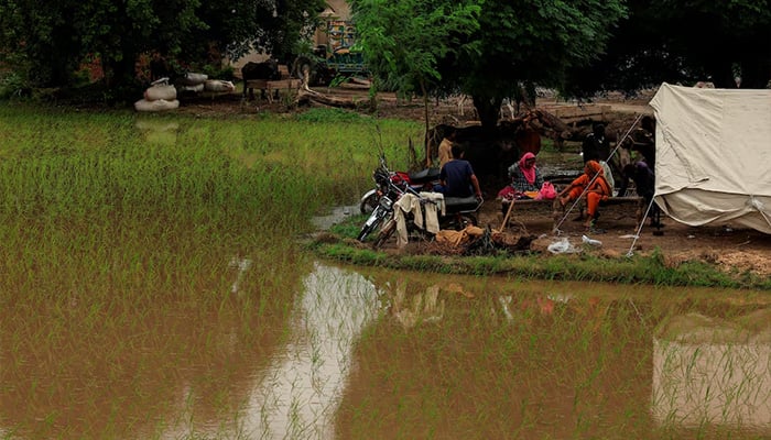 A family with their belongings takes refuge on a rooftop near the Chenab River in Wazirabad, Punjab province, Pakistan, following monsoon rains and rising water levels.