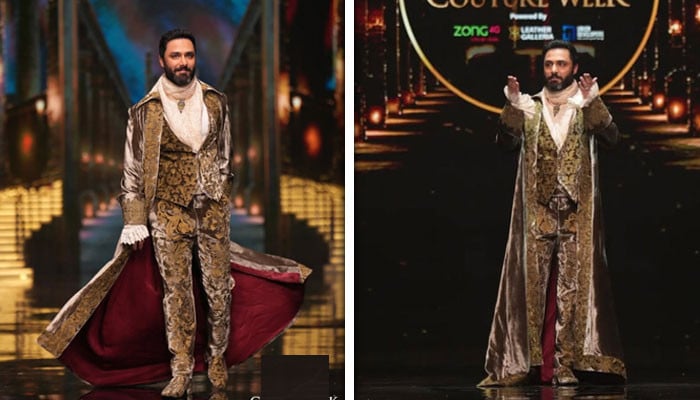 Pakistani actor Ahmed Ali Akbar’s distinctive style has drawn a wide range of reactions from fans and critics alike. Known for his impressive performances in several hit dramas, Akbar recently appeared at the Bridal Couture Week as a showstopper, wearing a unique ensemble that has been both praised and criticized by fans.