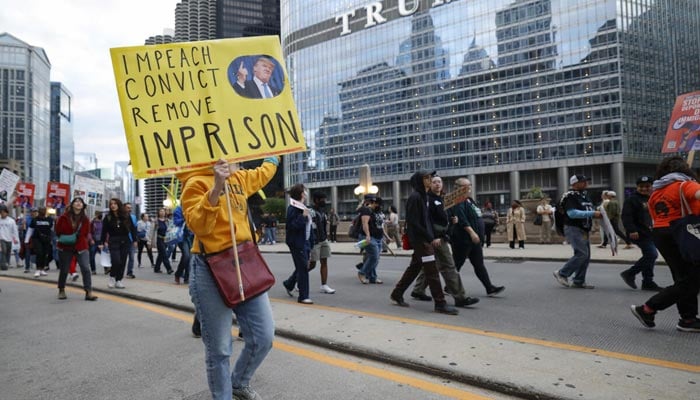 Anti-Trump protesters took to the streets of Chicago on Saturday, carrying signs that read “stop this fascist regime!” and “no Trump, no troops.” The protest route passed Chicago’s Trump Tower, and protesters made rude gestures at the building as they walked by. In Washington, D.C., where National Guard troops have been deployed since Trump declared a “crime emergency” in August, a thousands-strong protest marched through downtown with participants demanding an end to the “occupation.” Demonstrators in D.C. carried inverted US flags, a traditional symbol of a country facing existential peril.